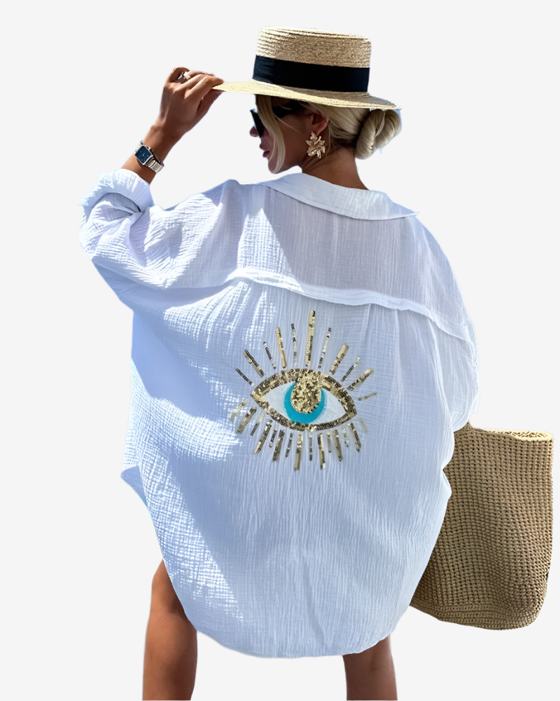 Présentation de la chemise à paillettes, conçue pour mettre en valeur votre beauté naturelle tout en étant élégante et confortable. Cette chemise combine une coupe ample et oversize avec un superbe motif œil brodé de paillettes et de perles dans le dos, qui apporte une touche d'élégance unique à un look décontracté. Que vous partiez pour une sortie chic ou que vous souhaitiez simplement vous détendre, la chemise à paillettes offre l'équilibre parfait entre un design chic et un confort tout au long de la journée.